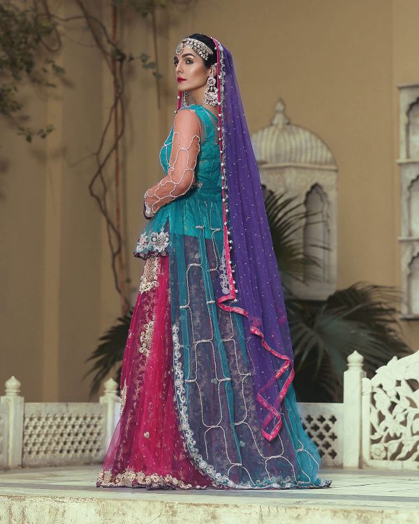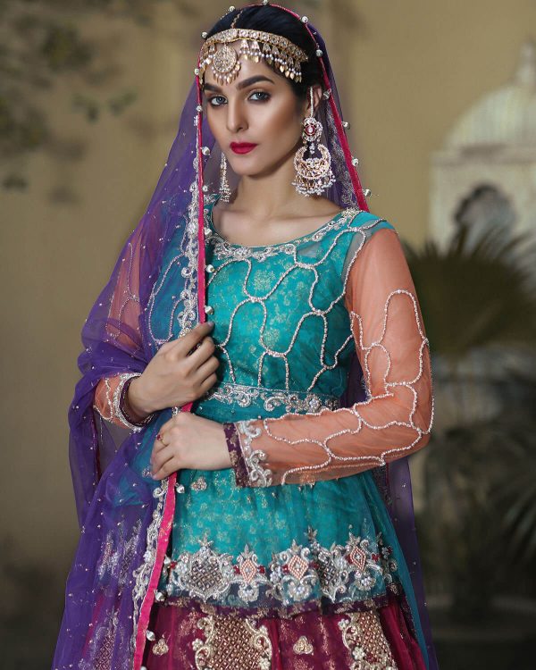 ?Attendre? This handworked sparkling design, heavily embellished with 3D gold and silver work with sequins, beadings, cut dana and threads. An alluring bridal Hmmm-have modern yet classic look
